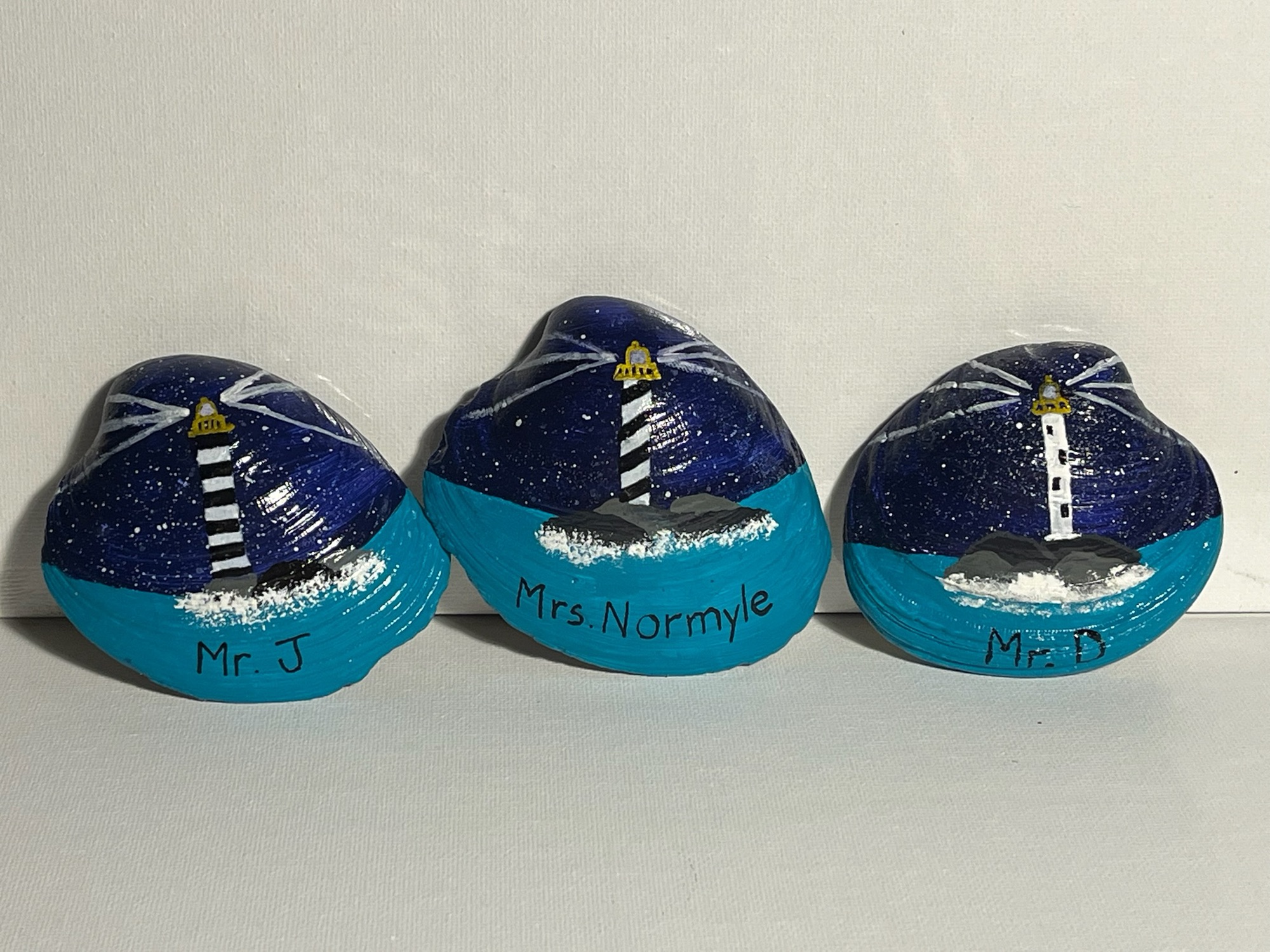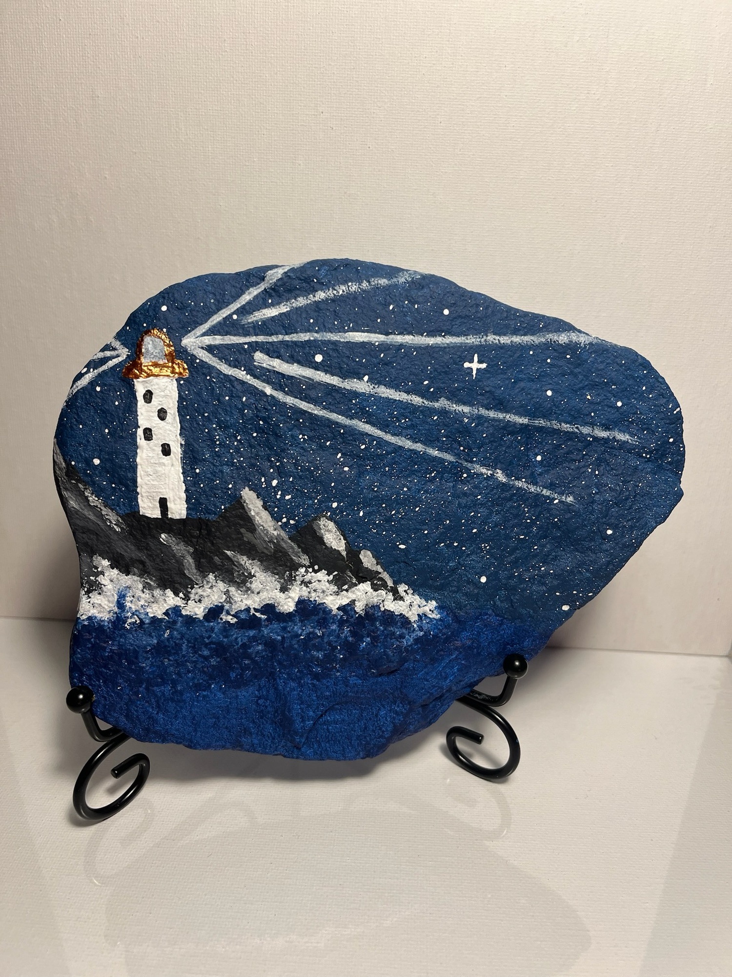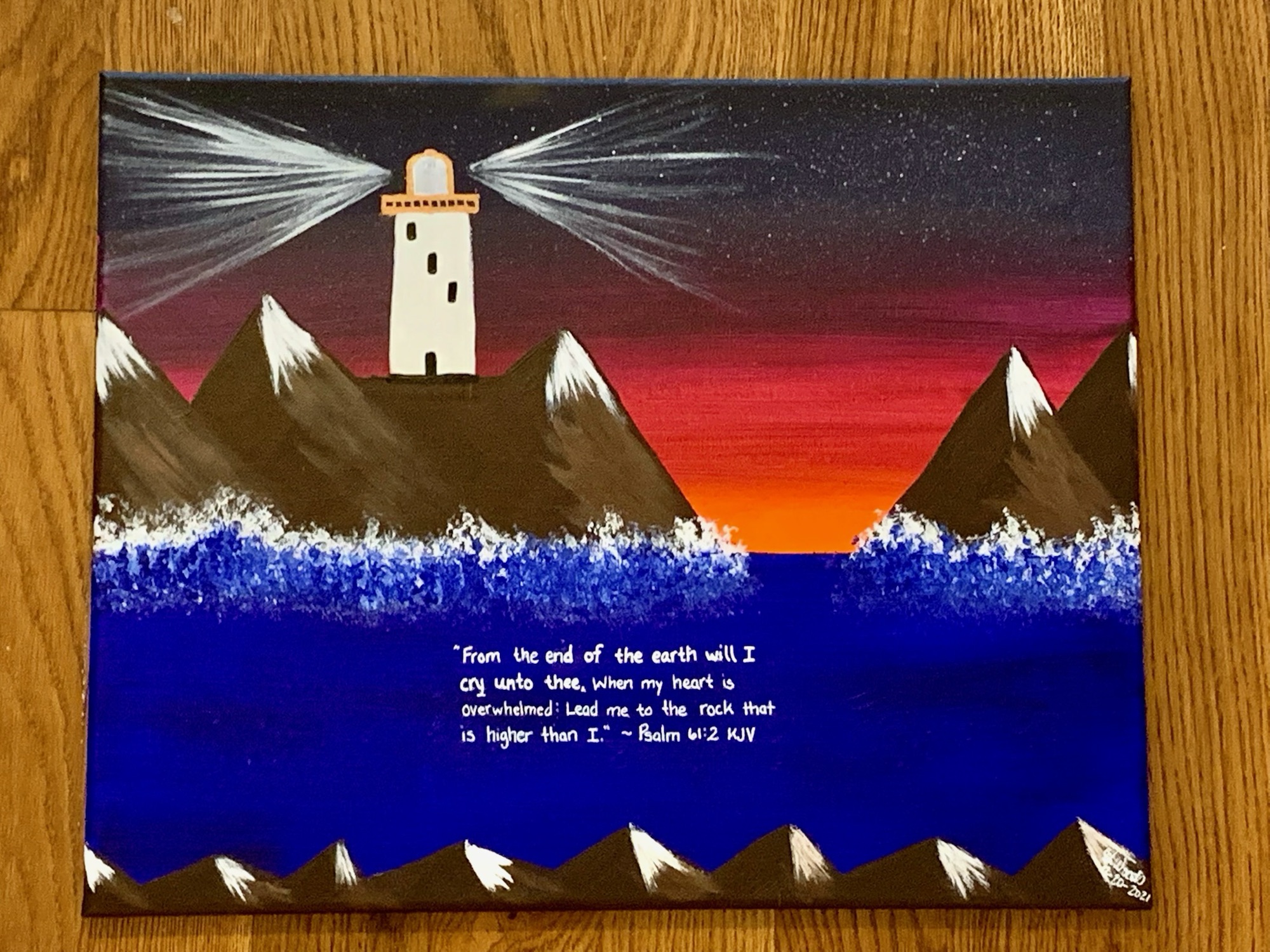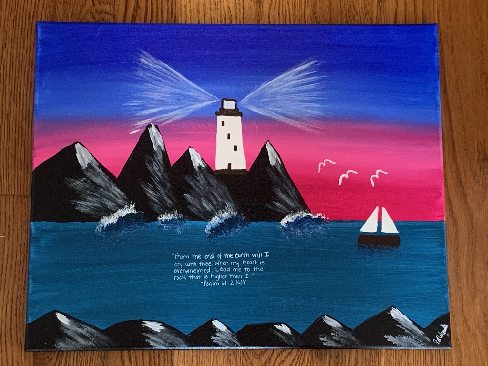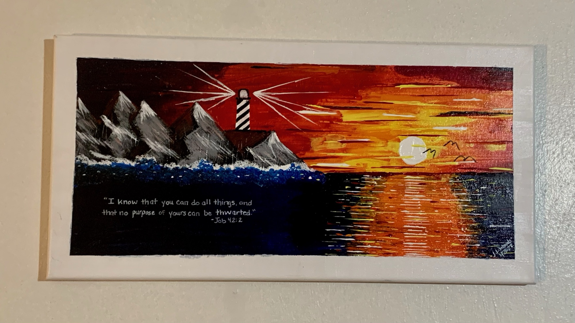“The Rock that is higher” 16”x20” acrylic on canvas“Wait on the Lord” 10”x20” acrylic on canvas “My Rock, My refuge” acrylic on rock (about 5” x 7”) **Available for purchase $30**“No purpose of God can be thwarted” acrylic on 10”x20” canvas“Wherever I am, God is” 16”x20” acrylic on canvas“Lead me” acrylic on canvas 16”x20”“Morning Light” acrylic on 6”x6” panel“In the Day of Trouble” triptych lighthouse – each canvas is 10” x 20” **Available for purchase $90**“Lighting the Way” teacher shells painted with acrylics